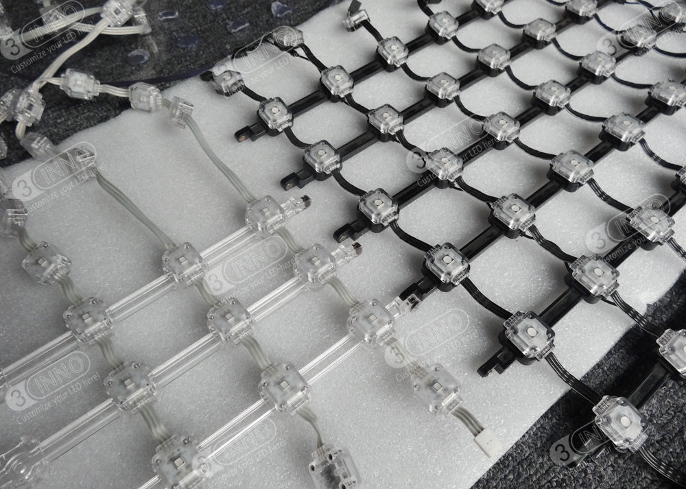 Outdoor / Indoor IP65 Soft Concert LED Display P35 / P40 / P55 / P80mm Main Feature: Flexible soft led mesh made by separate led pixels, 32dots/string or more; Modular design, fast set-up, take-down and replacement; 3D effect available with double-sided display; Magnetic buckle make connection fast, perfect for rental; Many shapes could be made such as square, rhombus, double-sided, ball, column, etc.; 90% Transparency design ; IP65/IP66, suitable for outdoor application