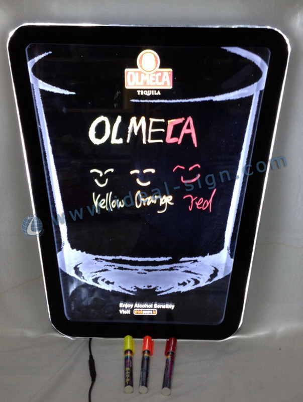 Quick detail: ISLWB 001 Material: transparent acrylic, black acrylic, led Product Type: fluorescent led writing board Use: Bar /club / promotion /advertisement technics: Printing way: logo can be CYMK , Acrylic laser cutting & carving Brand Name: OEM Model Number: ISLWB 001 Size: 60cm(h),50.4cm(top),36.6cm(below) Place of Origin: Guangdong China (Mainland) Supply Ability: 1000 Unit/ Units per Month Description: LED writing board.You can write words and draw pictures on the