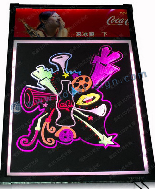 Quick detail: Material: transparent acrylic, black acrylic, led Product Type: fluorescent led writing board Use: Bar /club / promotion /advertisement technics: Printing way: logo can be CYMK , Acrylic laser cutting & carving Brand Name: OEM Model Number: ISLWB 004 Size: 60*40cm Place of Origin: Guangdong China (Mainland) Supply Ability: 1000 Unit/ Units per Month Description: LED writing board.You can write words and draw pictures on the board with fluorescent pens but easy